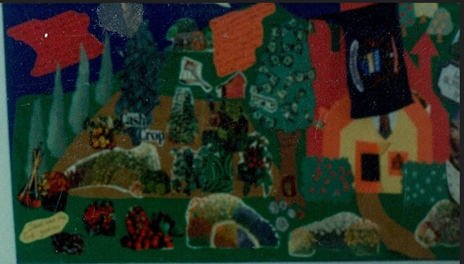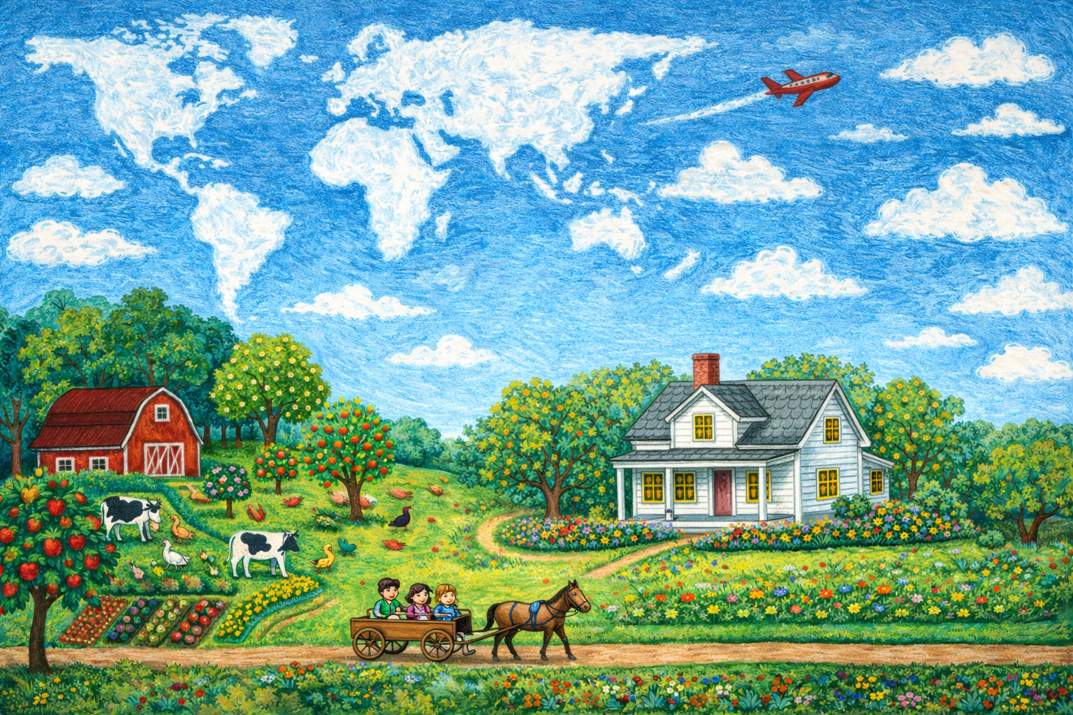 I created this vision board back in 1989, in our home in Michigan. Our main goal was to somehow purchase a farm. We wanted to be self sufficient. We knew a farm could do that and it would help teach our kids to how work and the kids would learn bucketloads of common sense and learn to be responsible. We didn’t know where, nor how we would accomlpish that. The first image in the left in the upper right corner of the photo of Nathan’s birthday party, you can see a piece of the first vision boad I made. I included a homeschool logo from a homeschool conference I had attended because My intent was to homeschool our kids. This is the only photo I have of the original vision board of the farm we wanted. The original vision board had a blue sky in the shape of continents, Which I had found in a Forbes magazine and pasted in the blue sky, then sketched a timy plane flying through the sky. Because I had no photo of the vision board, I asked AI to create and image of a farm surrounded with abundance with an airplane zooming through clouds in the shape of the continents. My vision and intent was to live on a farm and for the Day Family to travel the world together.